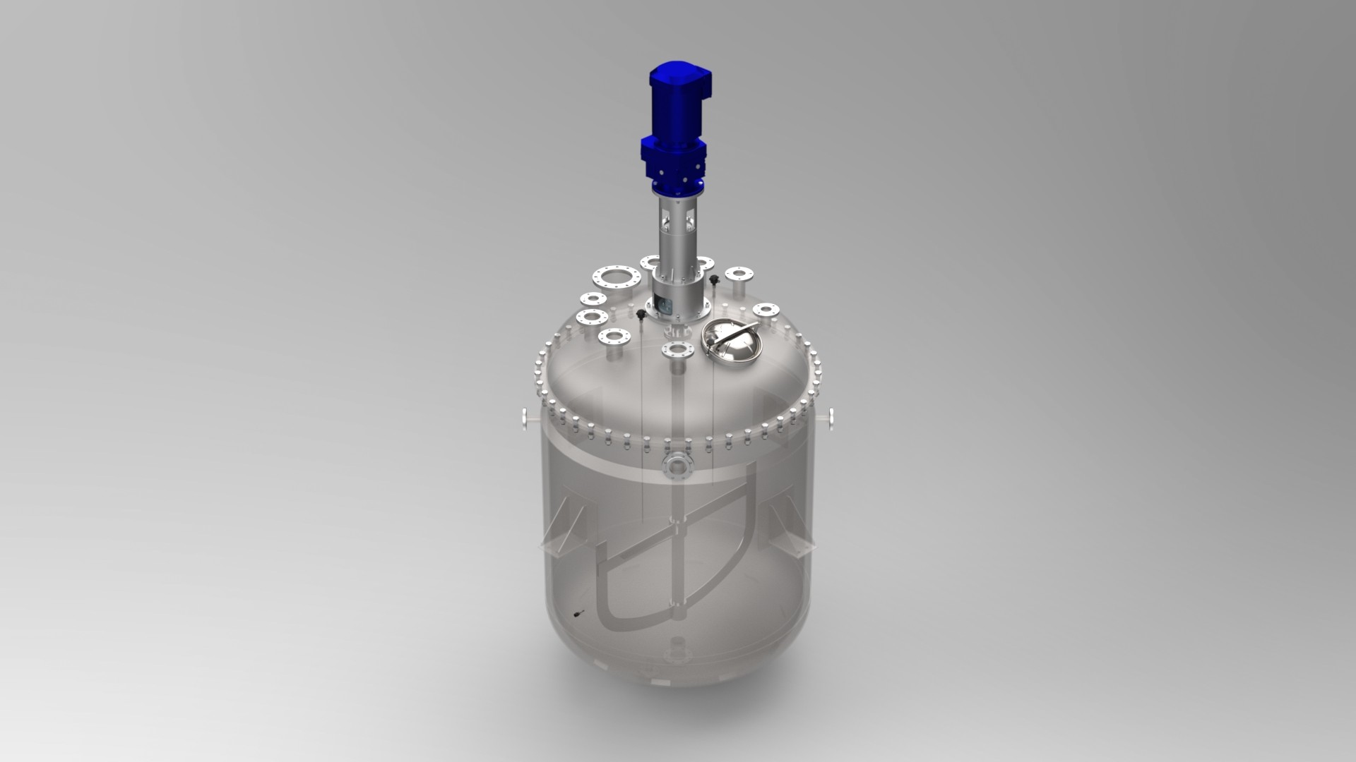 Вакуумный реактор предназначен для технологической обработки пастообразных продуктов парфюмерно-косметической и лакокрасочной промышленностей. Вакуумный реактор - герметичная теплоизолированная емкость, состоит из ванны внутренней, к которой герметично приварен змеевик циркуляции пара или хладагента, теплоизоляции, перемешивающего устройства с приводом, парового барбатера для обработки продукции острым паром, наружной облицовки, откидной крышки. В конструкции реактора предусмотрена система трубопроводов и запорной арматуры, позволяющая изменять в широком диапазоне технологические параметры процесса обработки продукции (нагрев, охлаждение, обработка острым паром, деаэрация с помощью вакуума, вакуумное выпаривание при производстве густых и пастообразных продуктов плодово-ягодного ассортимента). Для более равномерного нагрева и охлаждения продукта в реакторе имеется мешалка. Вращение мешалки осуществляется от привода, который располагается на откидной крышке миксера. На крышке также установлены предохранительный клапан и кран связи с атмосферой. Вакуумный реактор с мешалкой работает по следующему технологическому циклу: обьёмное дозирование растворимых компонентов в приемную воронку и загрузка их в основную варочную емкость с помощью вакуума -> весовая загрузка труднорастворимых компонентов -> перемешивание с помощью высокоскоростной пропеллерной мешалки и загрузка их в основную емкость с помощью вакуума -> в зависимости от технологического процесса обработки: нагрев с помощью парового барбатера (обработка продукта острым паром), или нагрев с помощью циркуляции пара по змеевику -> процесс гомогенезации или рециркуляции для выравнивания температуры продукта по всему обьему и более тщательного перемешивания -> охлаждение с перемешиванием с помощью подачи хладагента в змеевик (если это требуется технологическим процессом) -> обработка продукта вакуумом для удаления кислорода в целях увеличения срока годности готового продукта -> слив продукта. Контроль и управление технологическими параметрами процесса (температура, давление и время процесса) осуществляется в автоматическом или ручном режиме.