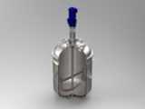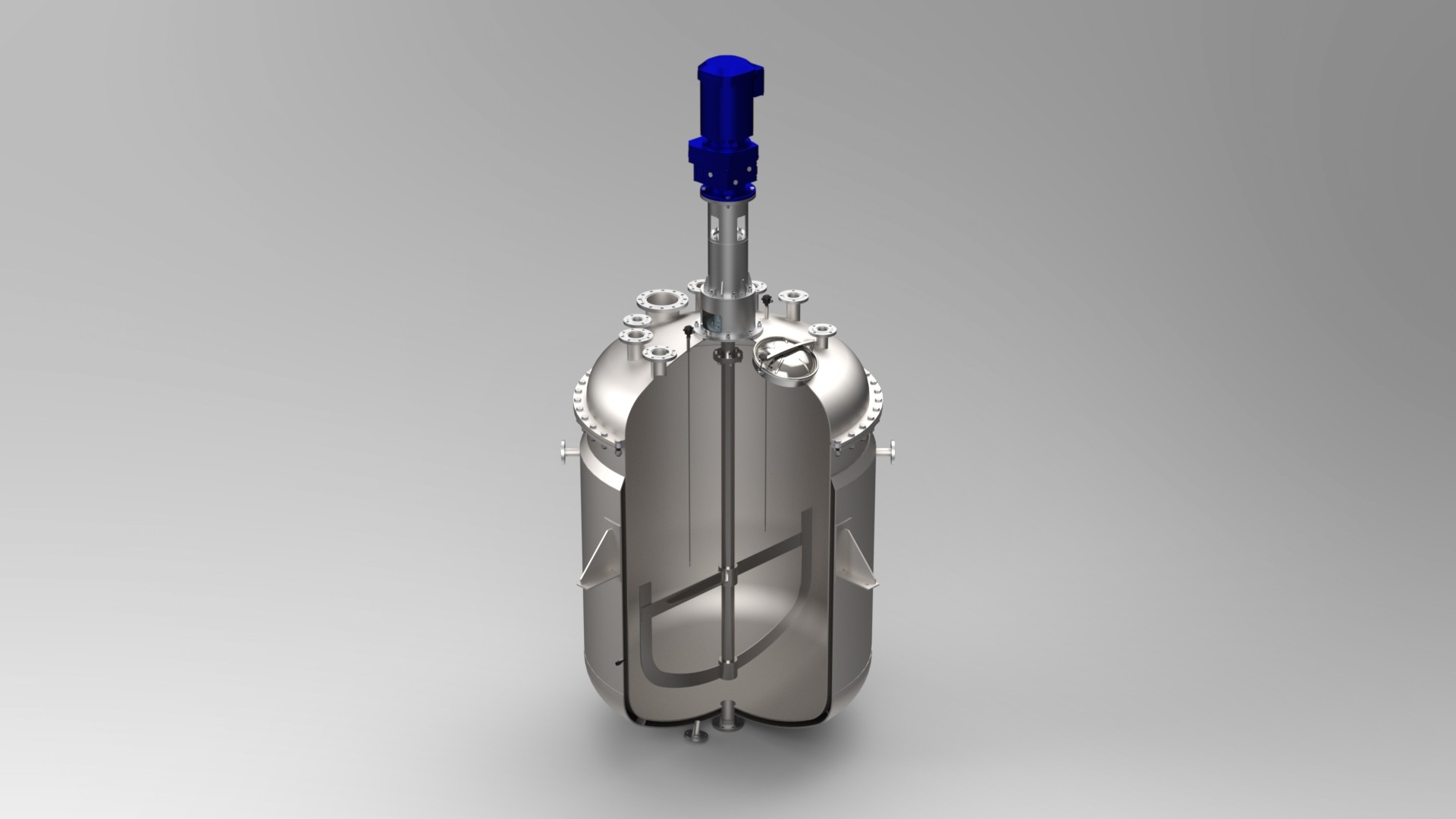 Вакуумный реактор предназначен для технологической обработки пастообразных продуктов парфюмерно-косметической и лакокрасочной промышленностей. Вакуумный реактор - герметичная теплоизолированная емкость, состоит из ванны внутренней, к которой герметично приварен змеевик циркуляции пара или хладагента, теплоизоляции, перемешивающего устройства с приводом, парового барбатера для обработки продукции острым паром, наружной облицовки, откидной крышки. В конструкции реактора предусмотрена система трубопроводов и запорной арматуры, позволяющая изменять в широком диапазоне технологические параметры процесса обработки продукции (нагрев, охлаждение, обработка острым паром, деаэрация с помощью вакуума, вакуумное выпаривание при производстве густых и пастообразных продуктов плодово-ягодного ассортимента). Для более равномерного нагрева и охлаждения продукта в реакторе имеется мешалка. Вращение мешалки осуществляется от привода, который располагается на откидной крышке миксера. На крышке также установлены предохранительный клапан и кран связи с атмосферой. Вакуумный реактор с мешалкой работает по следующему технологическому циклу: обьёмное дозирование растворимых компонентов в приемную воронку и загрузка их в основную варочную емкость с помощью вакуума -> весовая загрузка труднорастворимых компонентов -> перемешивание с помощью высокоскоростной пропеллерной мешалки и загрузка их в основную емкость с помощью вакуума -> в зависимости от технологического процесса обработки: нагрев с помощью парового барбатера (обработка продукта острым паром), или нагрев с помощью циркуляции пара по змеевику -> процесс гомогенезации или рециркуляции для выравнивания температуры продукта по всему обьему и более тщательного перемешивания -> охлаждение с перемешиванием с помощью подачи хладагента в змеевик (если это требуется технологическим процессом) -> обработка продукта вакуумом для удаления кислорода в целях увеличения срока годности готового продукта -> слив продукта. Контроль и управление технологическими параметрами процесса (температура, давление и время процесса) осуществляется в автоматическом или ручном режиме.