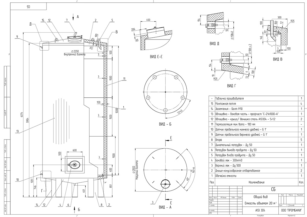 Облицовка – крыша/ донышко сталь AISI304, боковая часть – профлист.